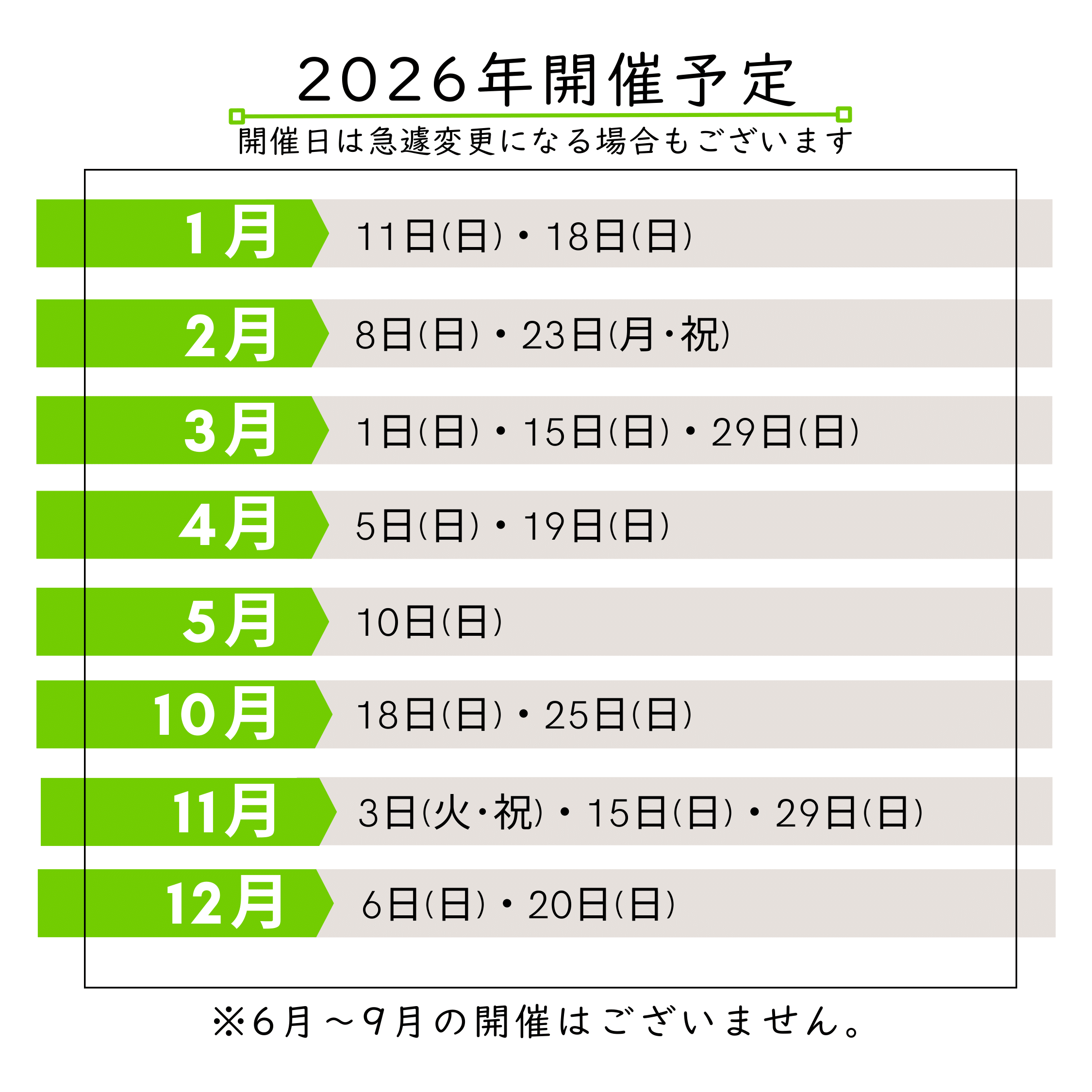 当日受付のみ(はがきによる受付無し) 出店受付は8:00~10:00まで(先着順)
