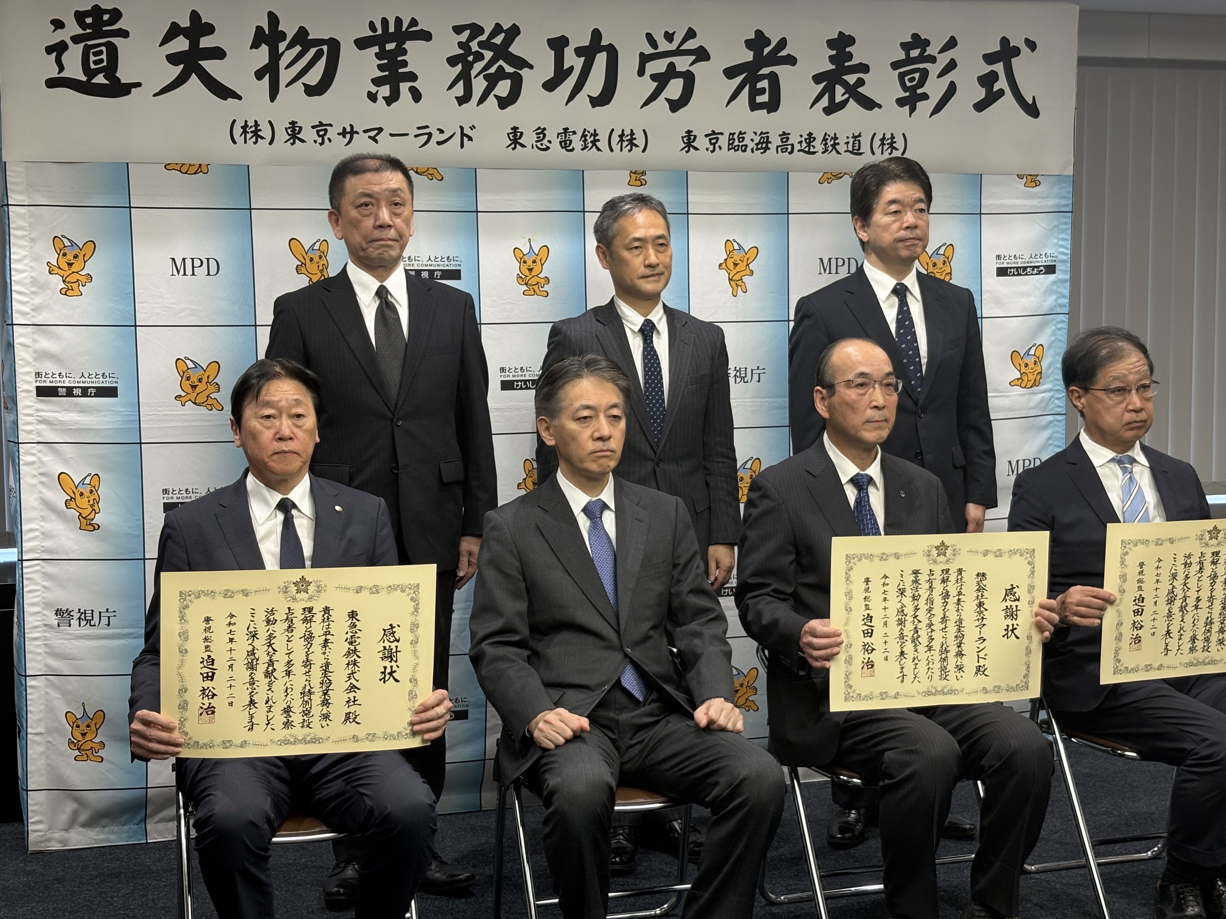 当社は本制度開始直後(2008年)に特例施設占有者の申請を行い、東京都公安委員会からの指定による特例施設占有者の第一号として、年間約8,000件の浮き輪や水着、ゴーグルなどのお客様のお忘れ物などを保管管理してまいりました※。この度、当社の取り組みが警察業務の効率化につながるとして評価され、警視庁から感謝状が授与されることとなりました。